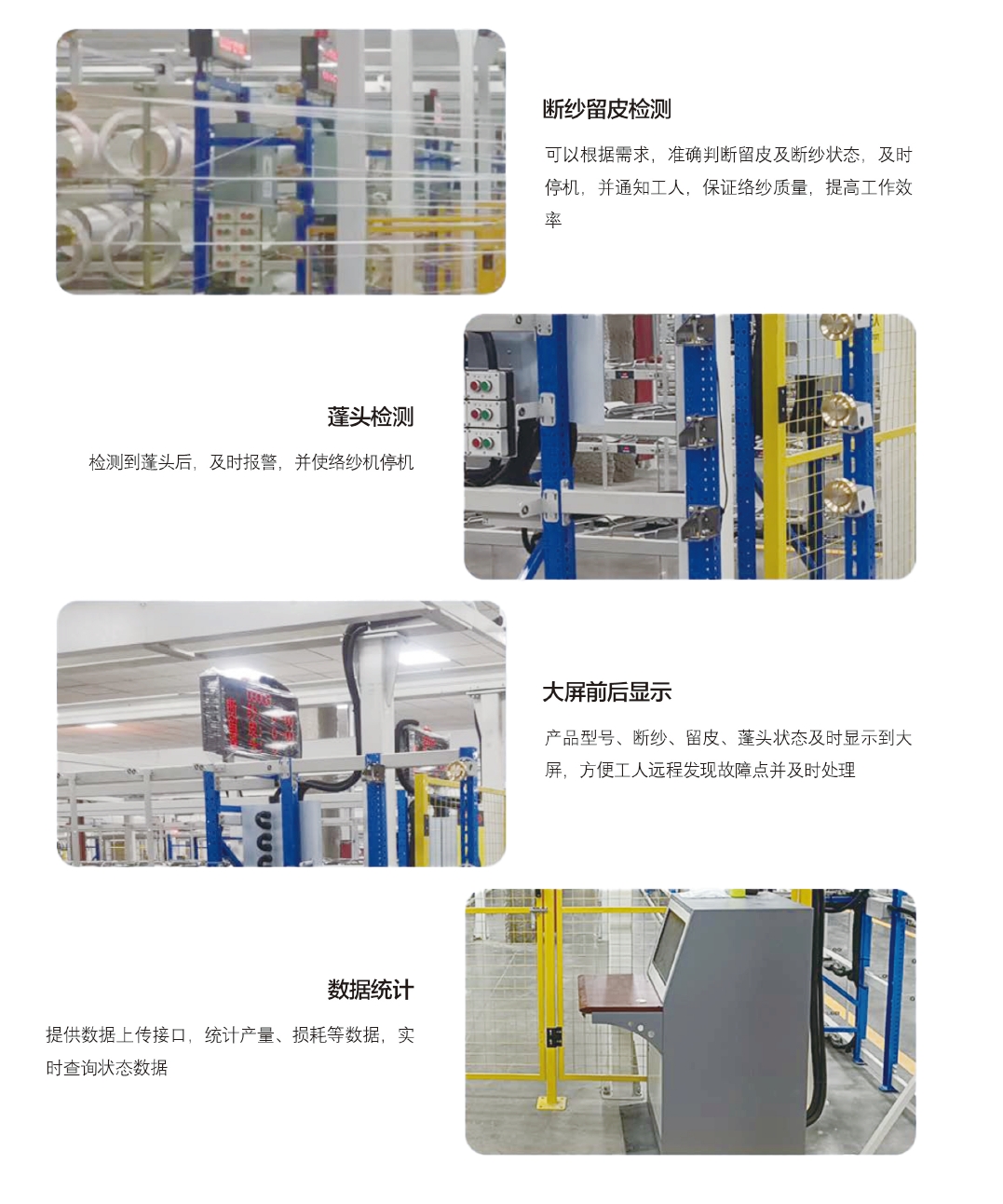 1、智能纱架与络纱机、涂油系统联动,在出现断纱、乱纱、留皮、误操作时停机的功能,配合机械臂自动上纱,具备产量统计,分析,检测等功能。